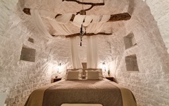 Scendendo dalla caratteristica scala ad arco in pietra, con i suoi gradini consumati dal tempo, si accede alla sala da pranzo, luogo sospeso fra la terra ed il cielo, dove si degustano le prelibatezze della cucina pugliese.